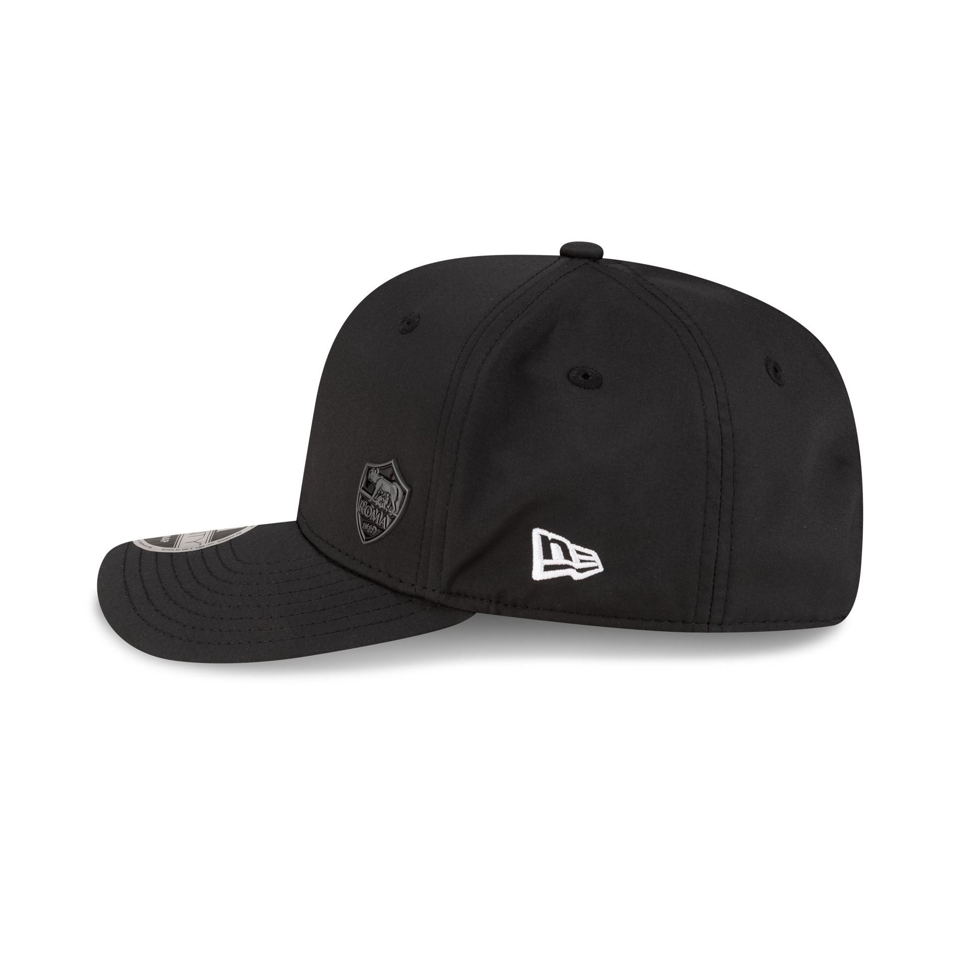 The AS Roma Flawless Pin Black 9SEVENTY Stretch-Snap Cap features an AS Roma pin logo at the front left panel with an adjustable stretch-snap closure at the rear and a black undervisor.