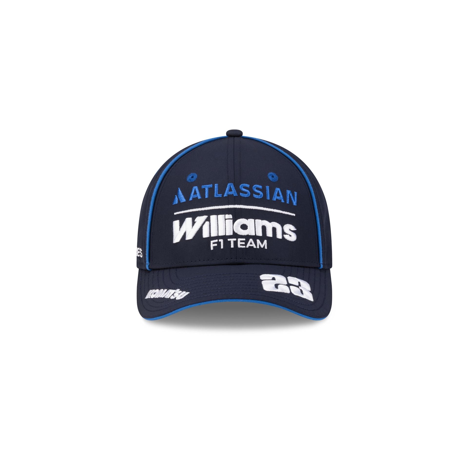 The Atlassian Williams F1 Team Alex Albon Kids 9FORTY M-Crown Snapback features an embroidered team wordmark at the front panels with a New Era Flag at the left-wear side and an adjustable snapback closure at the rear. Additional details include sponsors logos and team color piping details throughout the cap with the driver's number at the visor and an AA23 logo at a navy undervisor.