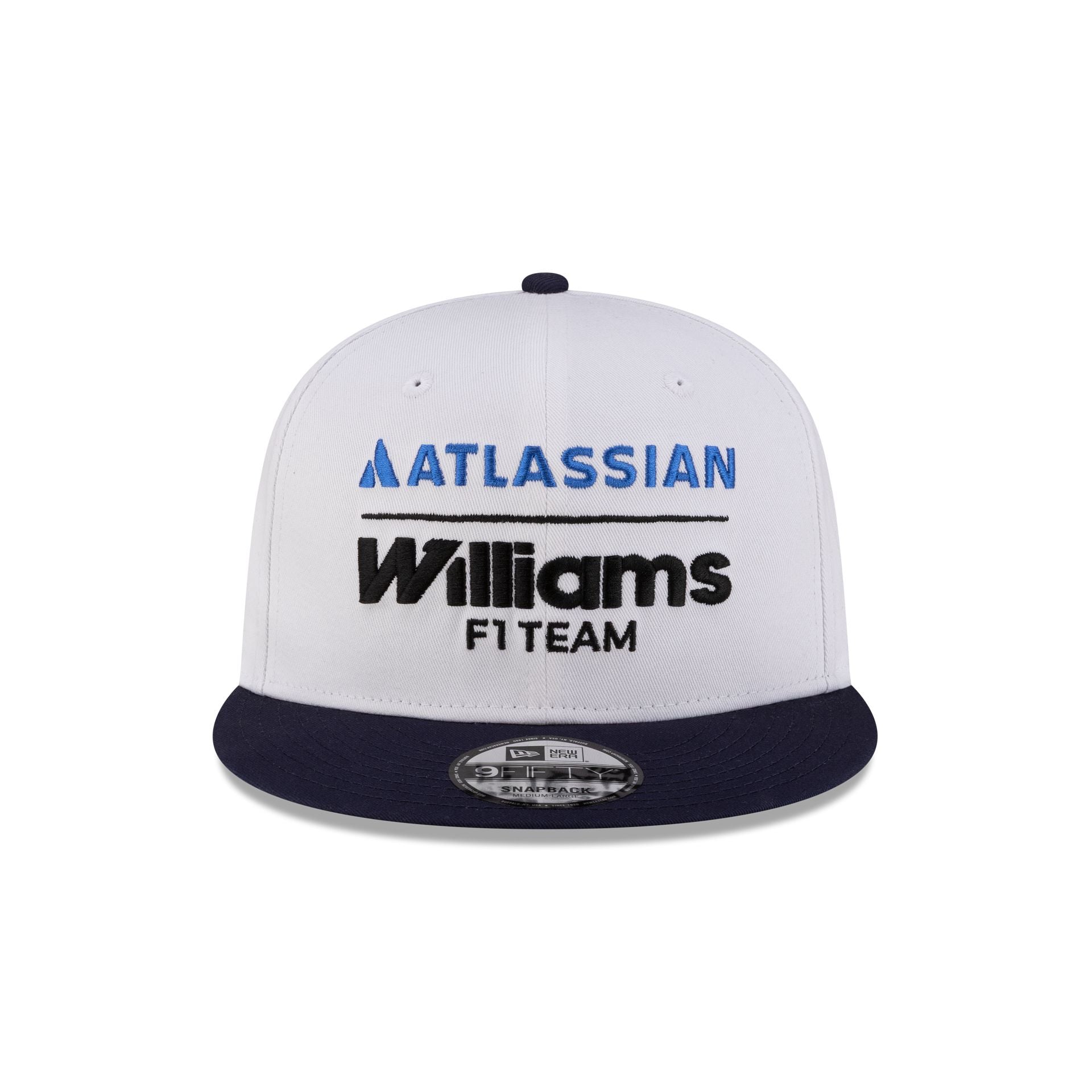 The Atlassian Williams F1 Team Essential White 9FIFTY Snapback features an embroidered team wordmark at the front panel with a New Era Flag at the left-wear side, a navy visor, and an adjustable snapback closure at the rear.