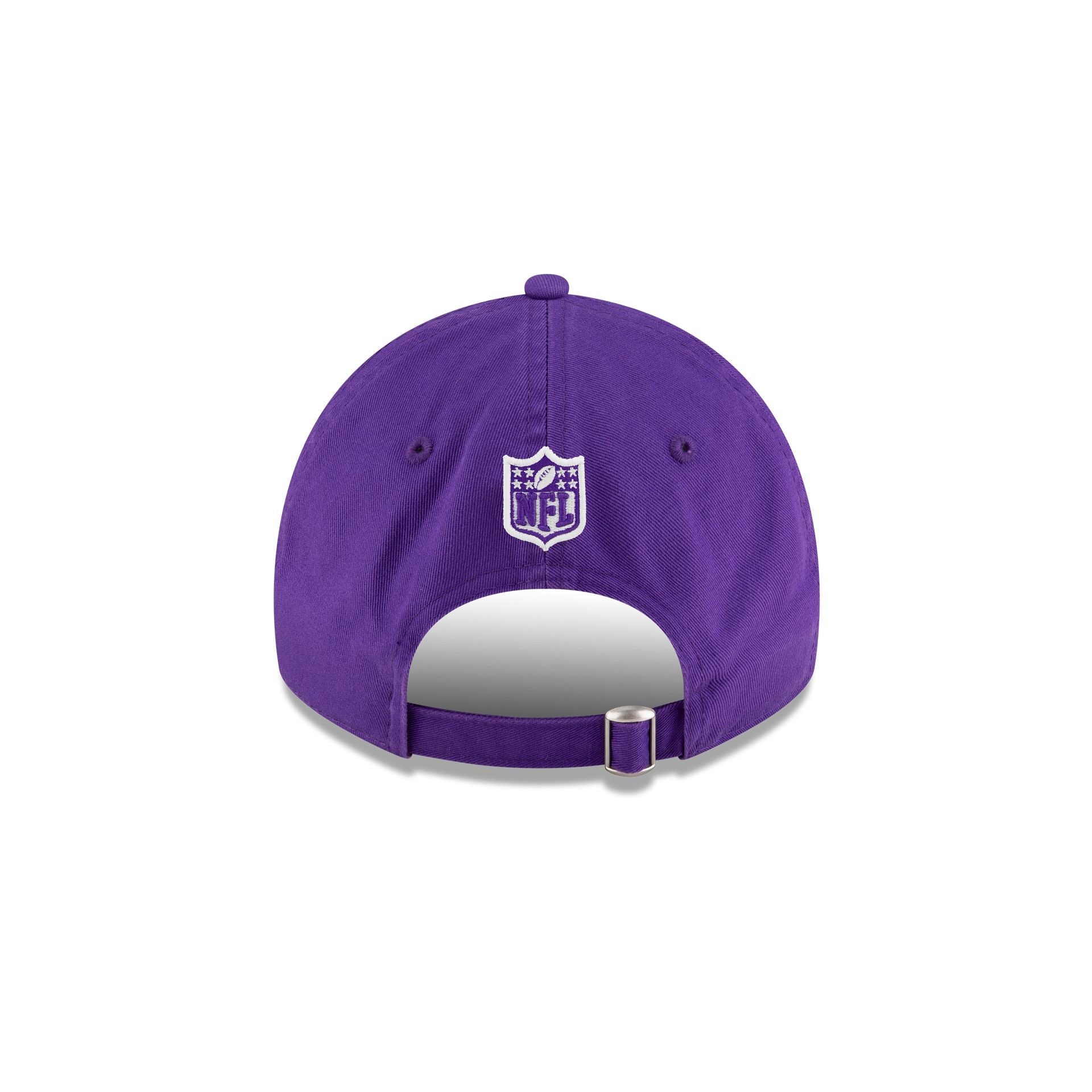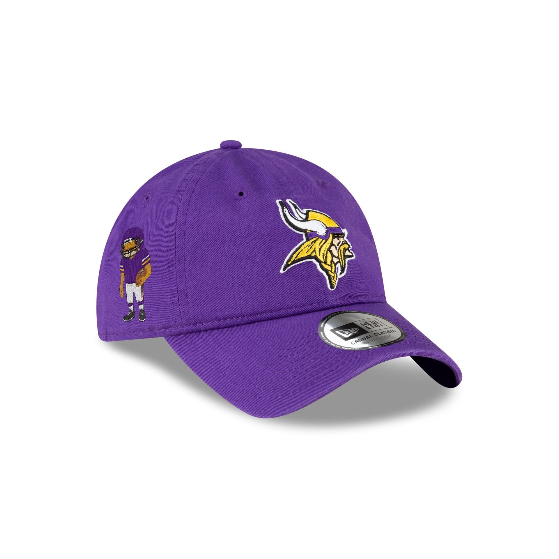 The Bad Bunny x Minnesota Vikings Concho Casual Classic Adjustable Cap features an embroidered Vikings logo at the front panels with an embroidered Sapo Concho football character at the right-wear side. Additional details include the NFL Shield logo above an adjustable D-Ring closure at the rear.