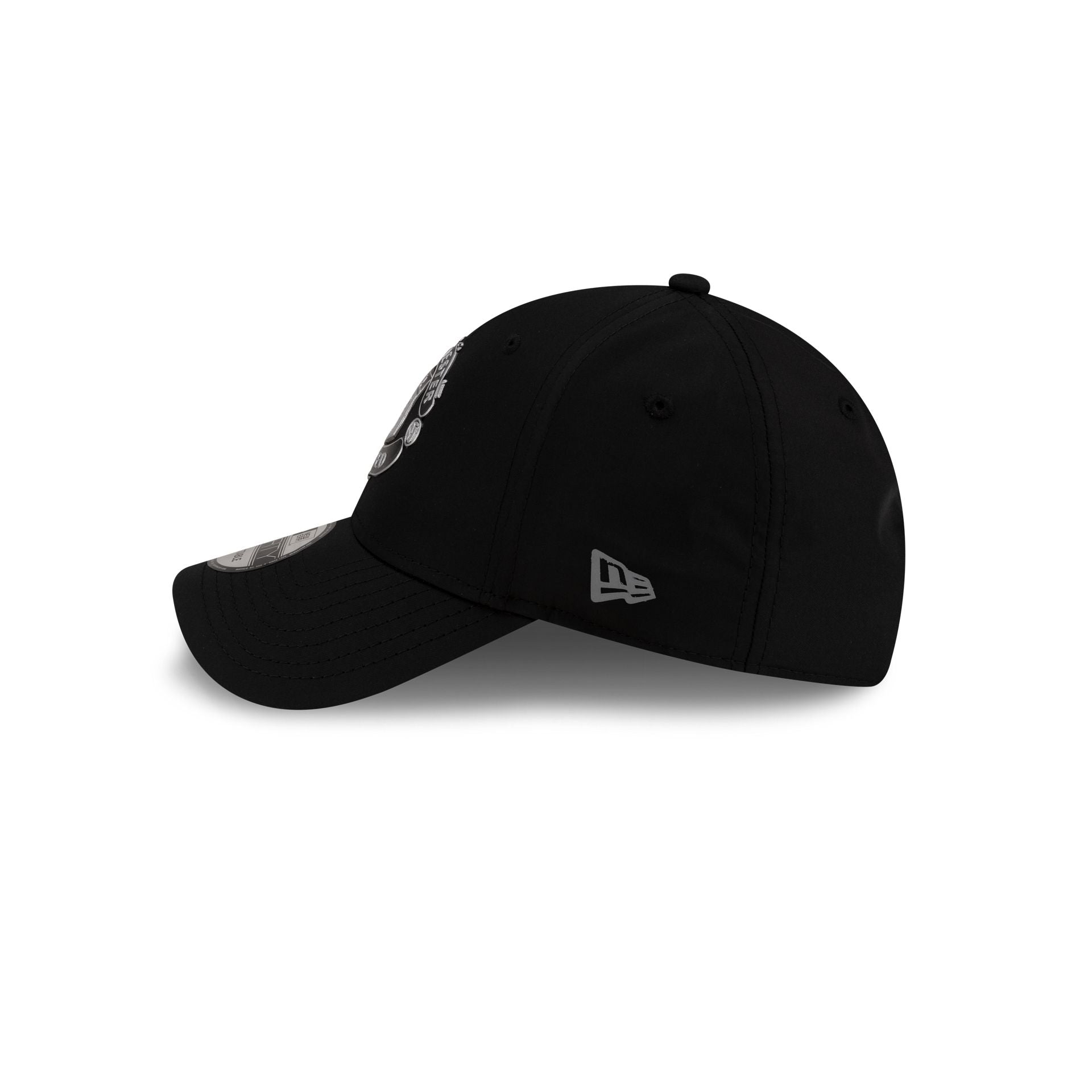 The Manchester United FC Reflective Patch 9FORTY Adjustable Cap features a reflective Manchester United patch at the front panels with an adjustable D-Ring closure at the rear and a black undervisor.