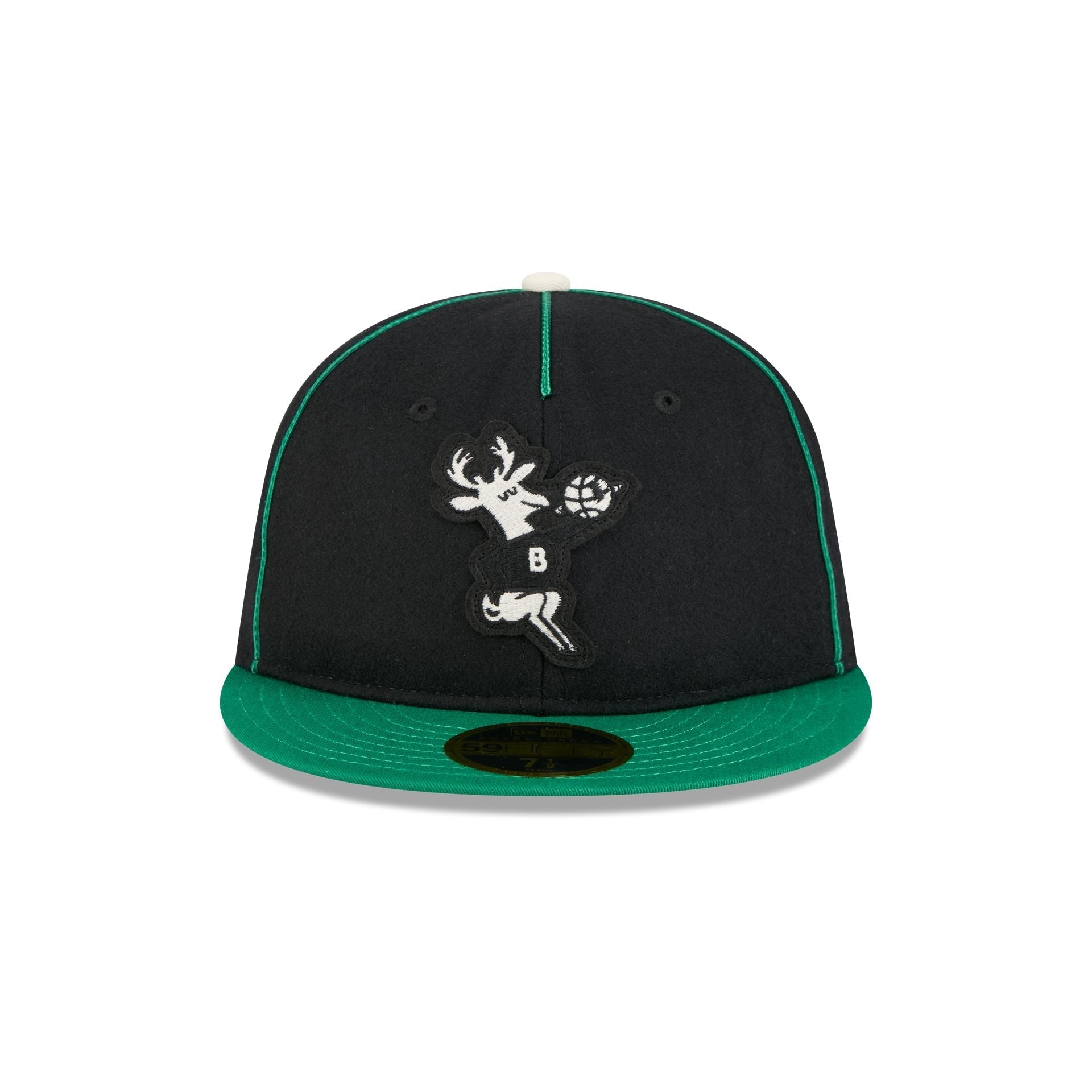 The Milwaukee Bucks Felt Logo Retro Crown 59FIFTY Fitted Cap features an embroidered Bucks Hardwood Classics felt logo at the front panels with the NBA Logoman at the right-wear side. Additional details include a team color piping at the crown and a green undervisor.