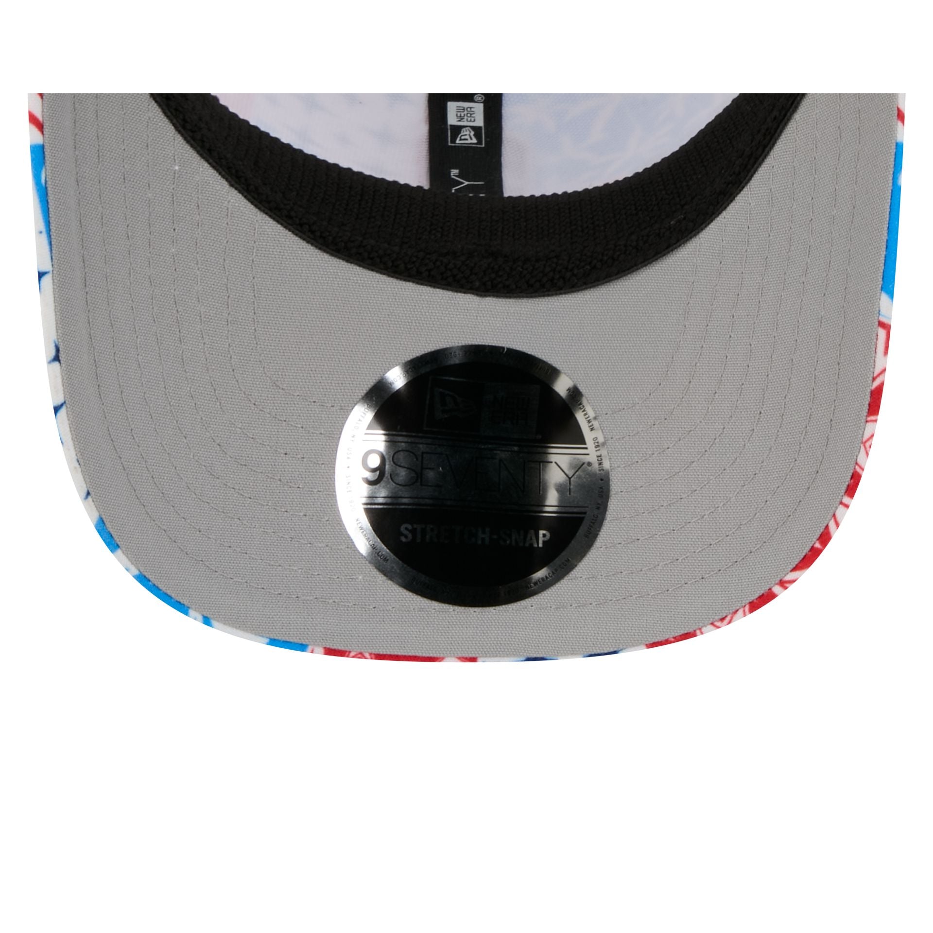 The NBA 2026 All-Star Game Quilt 9SEVENTY Trucker features an embroidered NBA Logoman at the front panels against a team quilt pattern. Additional details include an adjustable stretch-snap closure at a mesh rear and a gray undervisor.