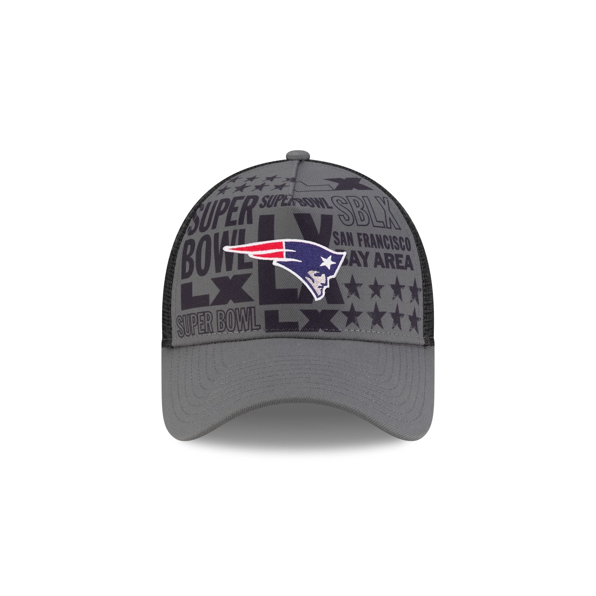 The New England Patriots Super Bowl LX Participation 9FORTY A-Frame Trucker features an embroidered Patriots logo at the front panels against a Super Bowl LX screen-print pattern. Additional details include a Super Bowl LX patch at the right-wear side with the NFL Shield above an adjustable snapback closure at a mesh rear.