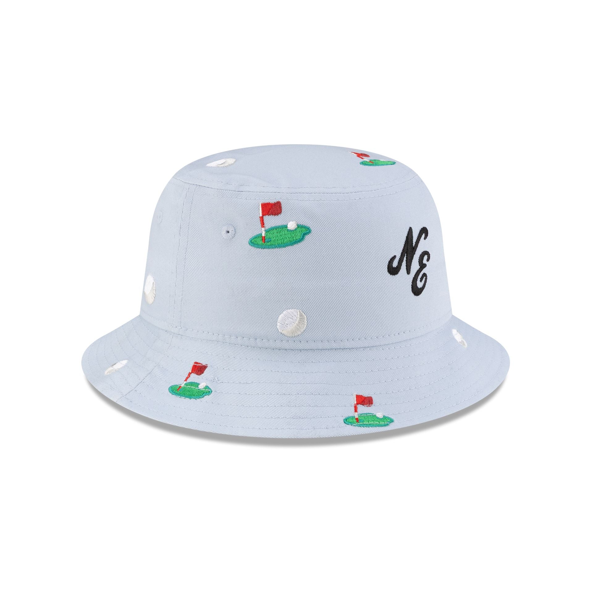 The New Era Cap Golf Club All Over Print Bucket Hat features an embroidered New Era logo at the front with embroidered golf balls and golf greens throughout the cap.