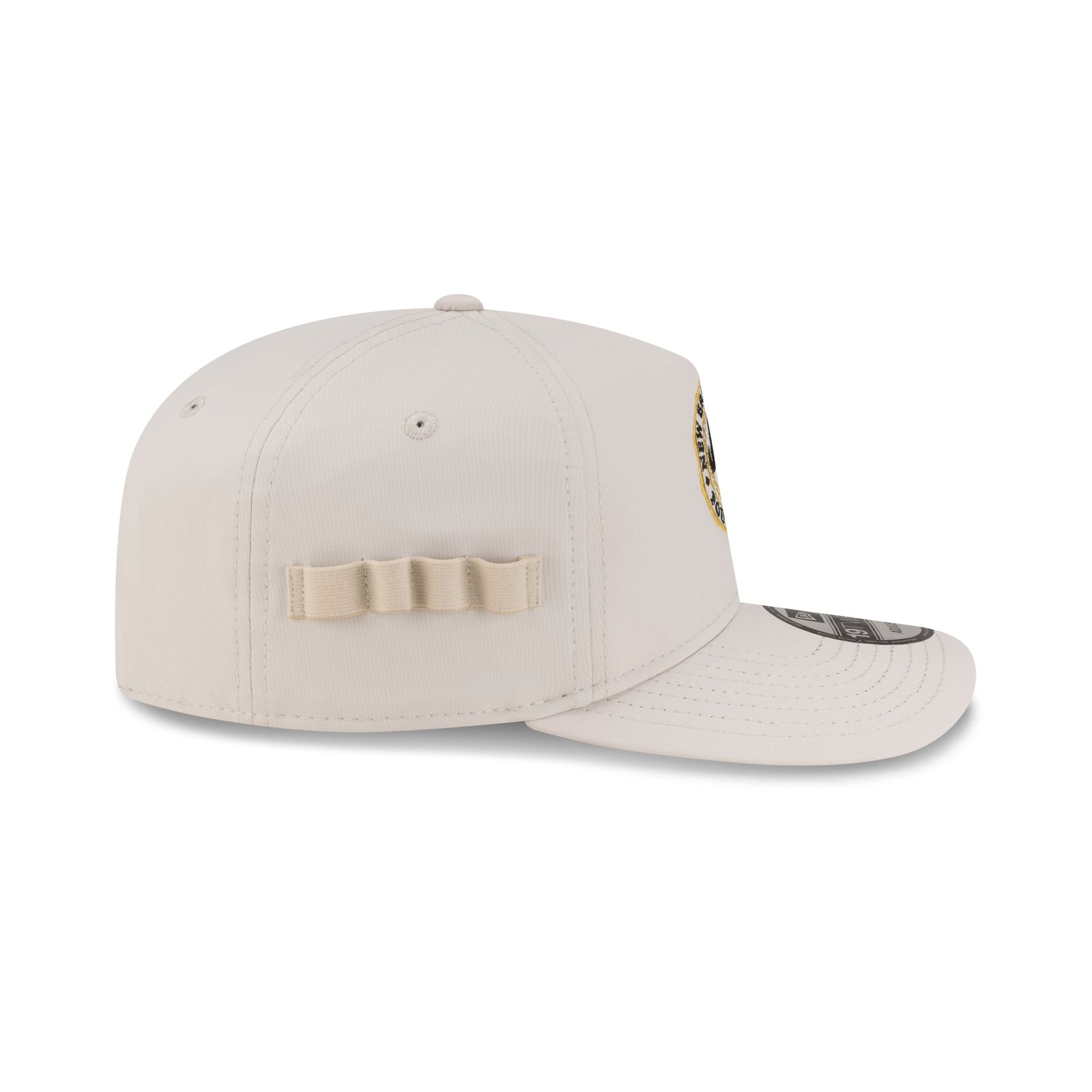 The New Era Cap Golf Club Chrome 19TWENTY Adjustable features an embroidered New Era Golf Club logo at the front panels with an adjustable snapback closure at the rear. Additional details include a pocket at the right-wear side for golf tees and a pencil with a chrome undervisor.
