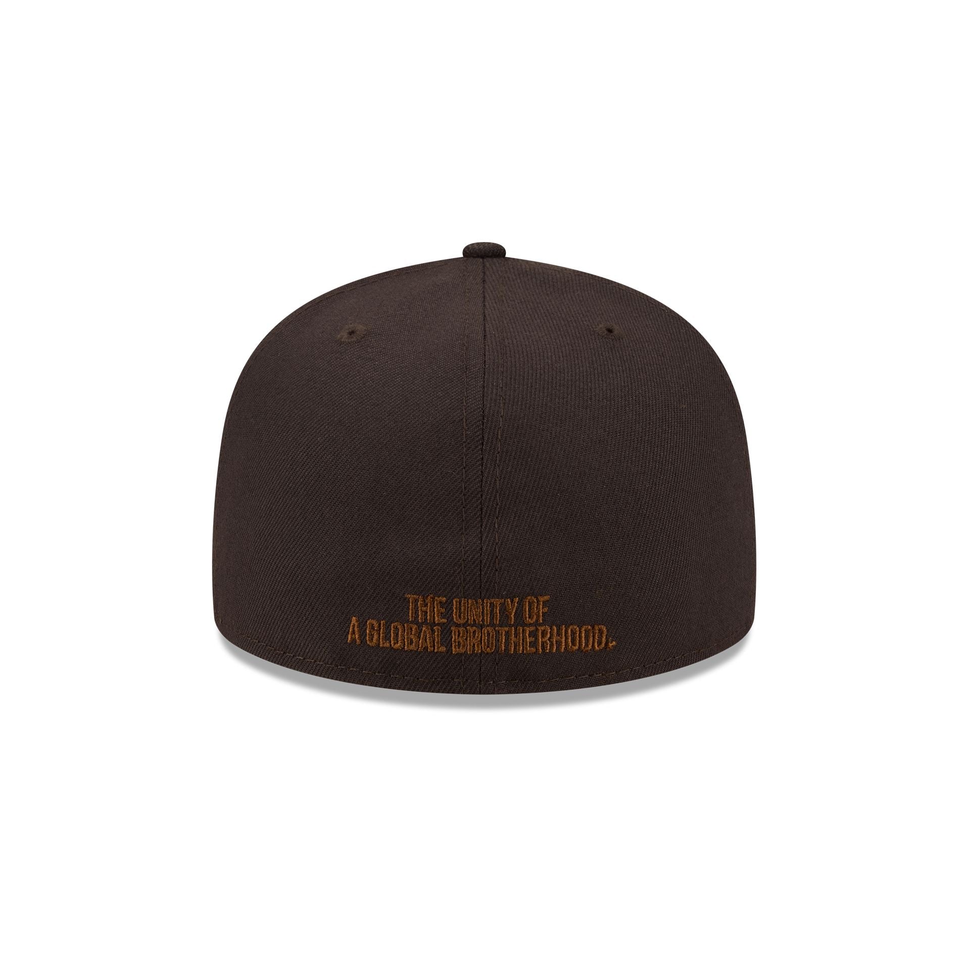 The New York Black Yankees Brown Suede 59FIFTY Fitted Cap features an embroidered Black Yankees faux suede logo at the front panels with a Negro League Baseball Museum patch at the right-wear side. Additional details include a "The Unity of a Global Brotherhood" embroidered wordmark at the rear and a green undervisor that reads "Together they overcame issues of segregation, racism, oppression, and language to break many cultural barriers."