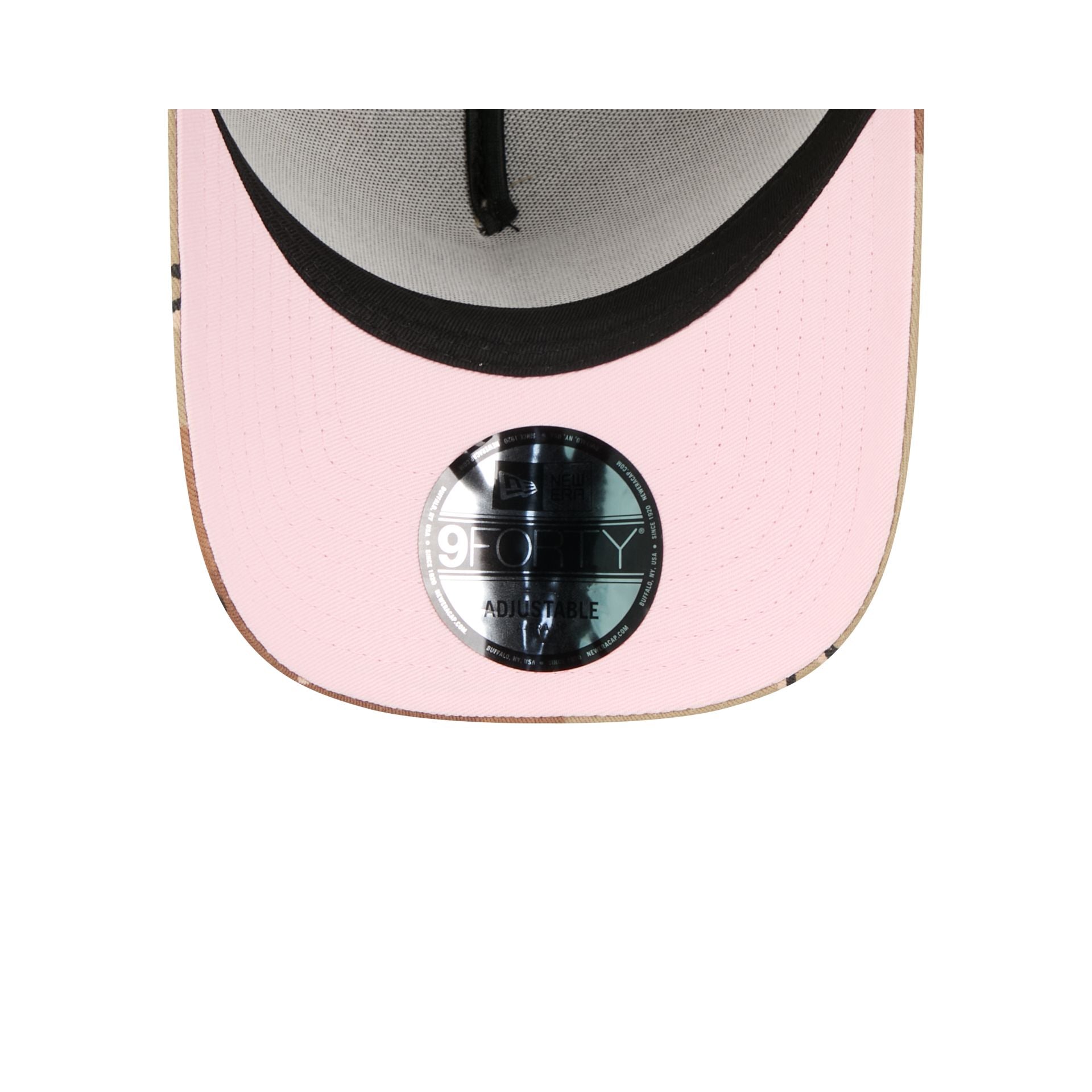 The New York Mets Camo Hearts 9FORTY A-Frame Snapback features an embroidered Mets logo at the front panels against a camo and heart print pattern throughout. Additional details include an adjustable snapback closure at the rear and a pink undervisor.