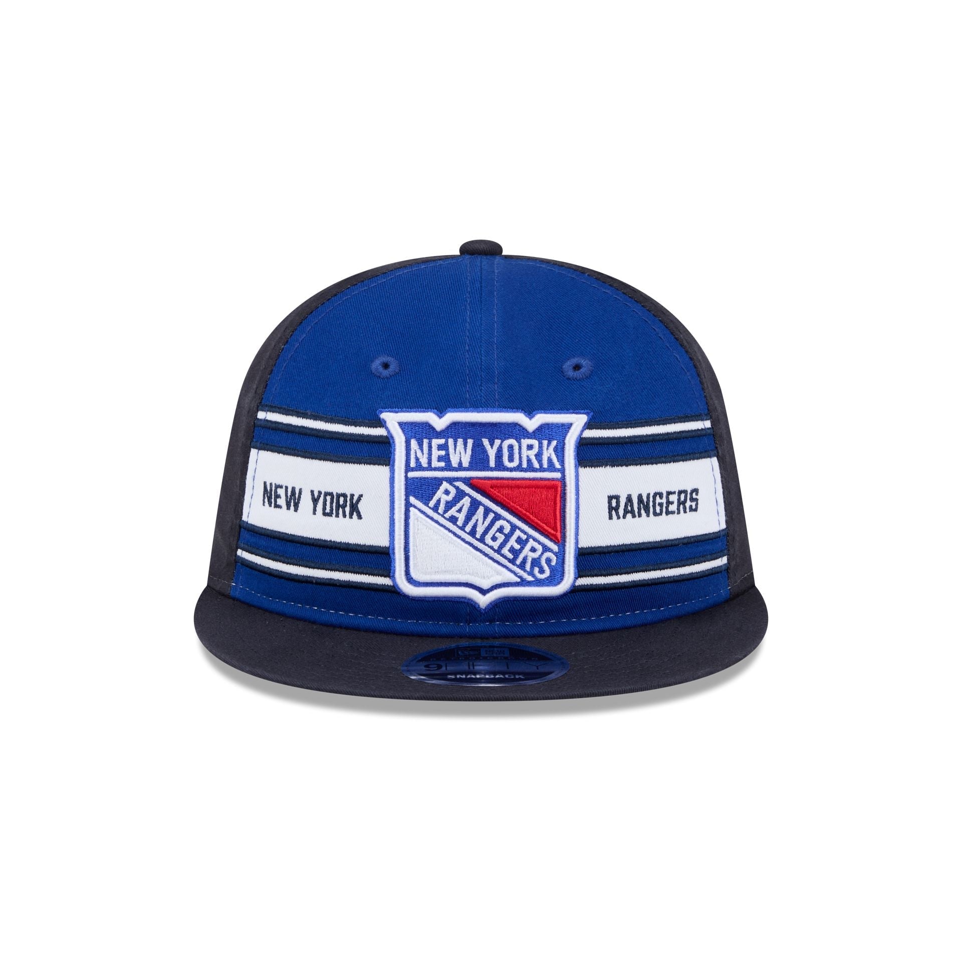 The New York Rangers Team Stripes Retro Crown 9FIFTY Snapback features an embroidered Rangers team stripe logo and wordmark at the front panels with an adjustable snapback closure at the rear.
