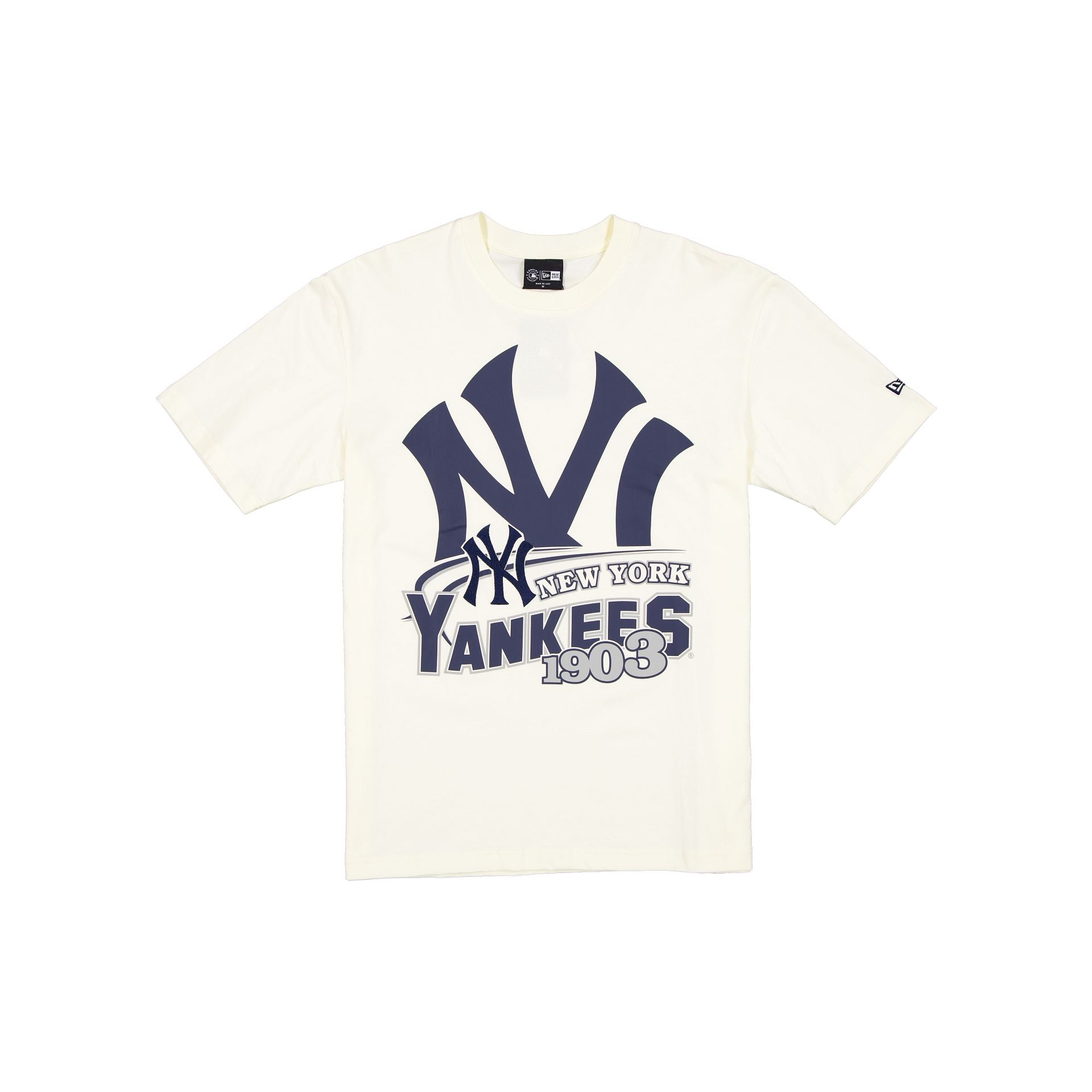 The New York Yankees Retro Chrome White T-Shirt features an embroidered Yankees logo and a screen-printed retro graphic at the front.