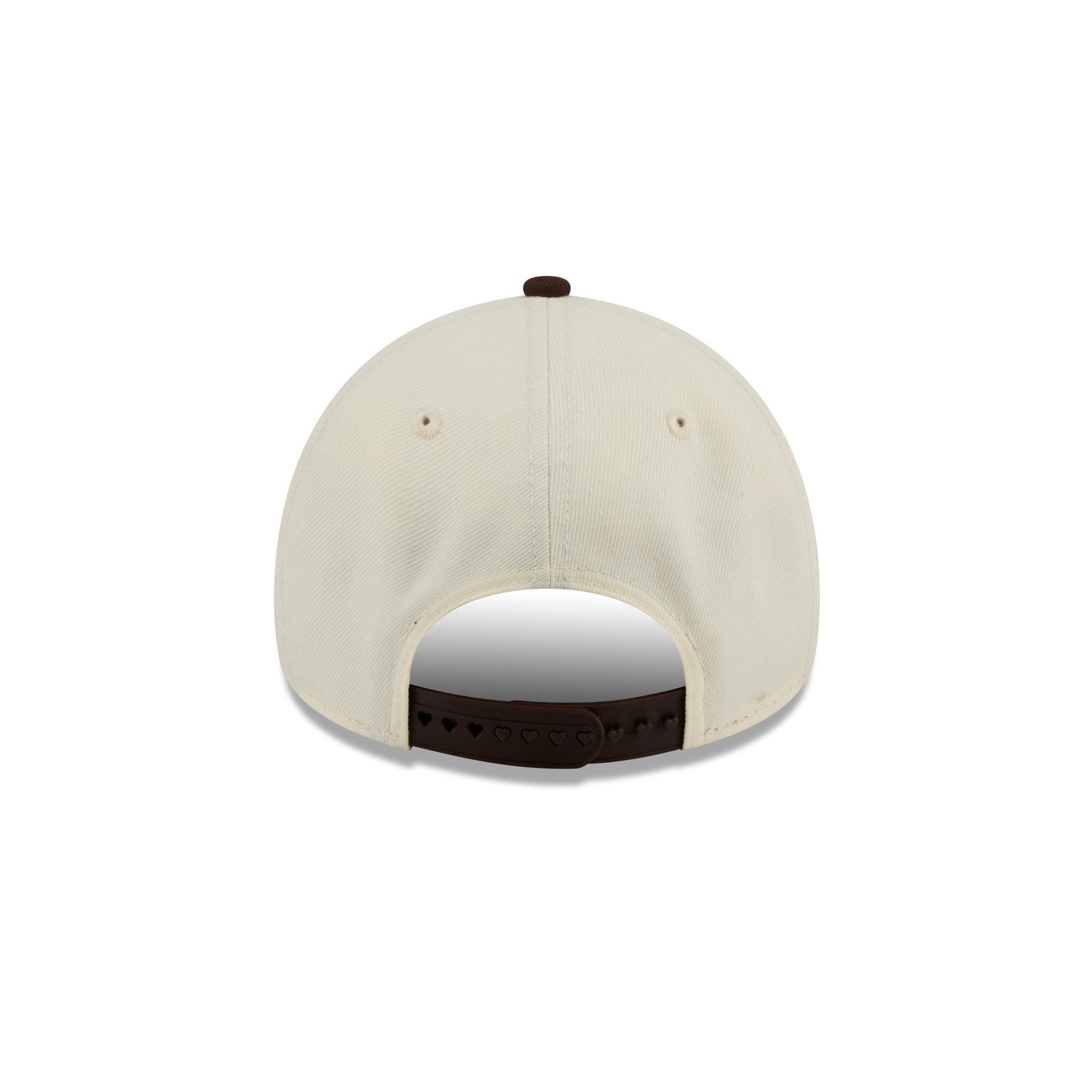 The San Diego Padres City Script 9FORTY A-Frame Snapback features an embroidered Padres logo at the front panels with a city script at the right-wear side. Additional details include an adjustable heart-shaped snapback closure at the rear and a pink undervisor.
