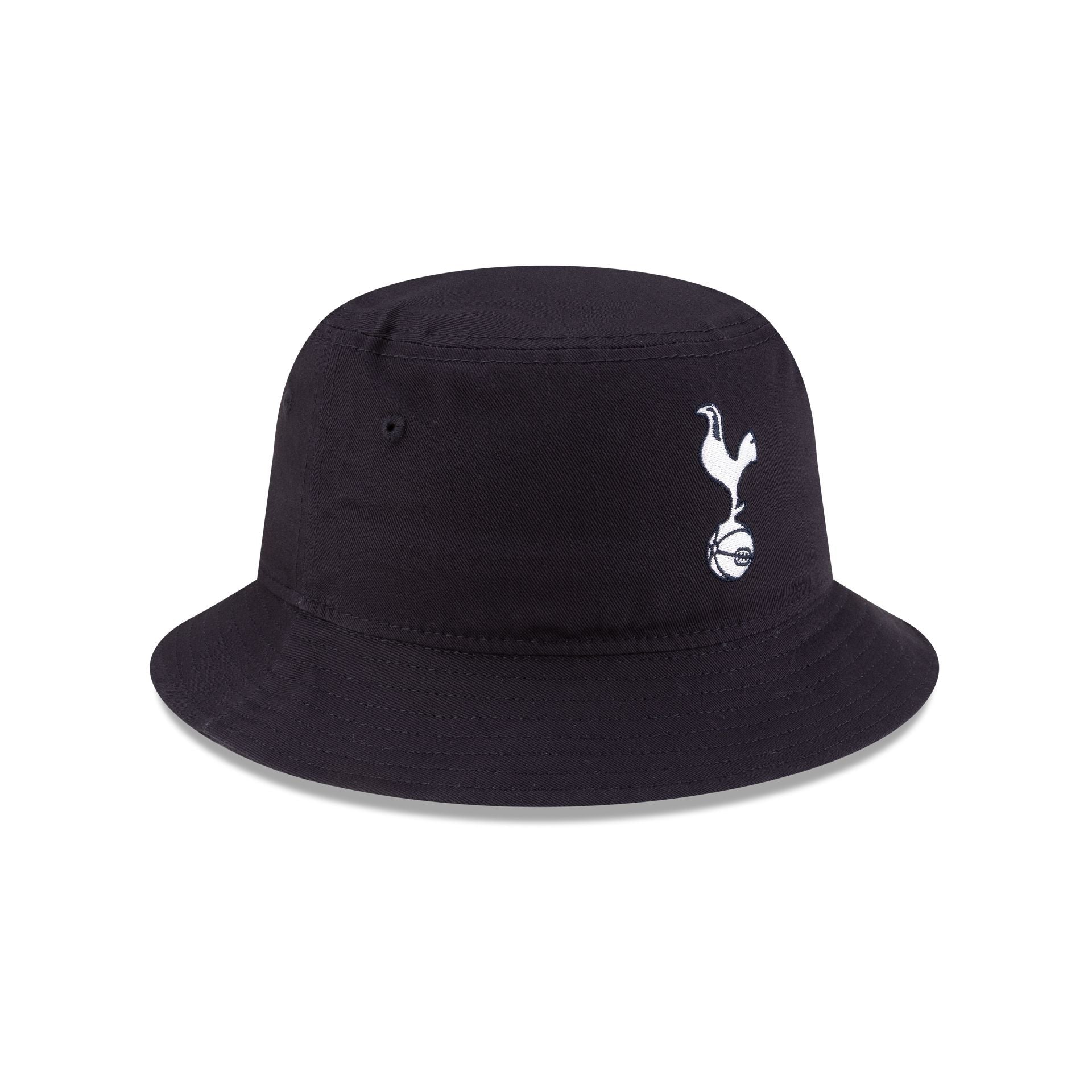 The Tottenham Hotspur FC Cotton Navy Bucket Hat features an embroidered Tottenham logo at the front with a New Era Flag at the left-wear side.